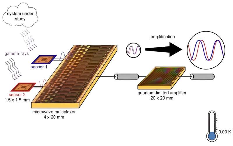 超導(dǎo)傳感器在非常低的溫度(約0.09開爾文)下工作,因此它們需要專門的讀出電子設(shè)備和放大器。這些放大器需要將來(lái)自多個(gè)傳感器的信號(hào)組合在一條讀出線上。組合信號(hào)稱為多路復(fù)用。