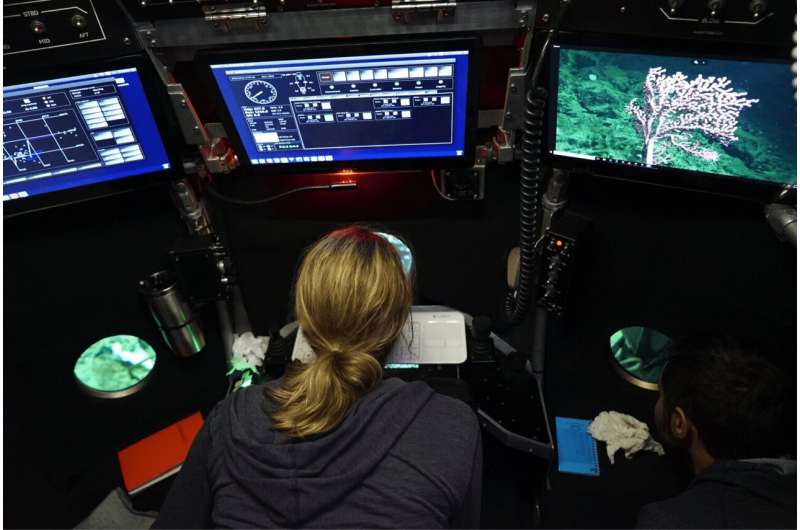 WHOI 科學(xué)家 Colleen Hansel 在 HOV Alvin 內(nèi)部。圖片來源:伍茲霍爾海洋研究所)