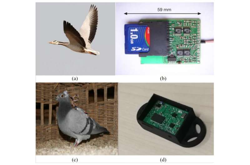 (a) 大型候鳥,斑頭雁,在飛行中。(b) 神經(jīng)記錄器:收集鴿子腦電信號和GPS位置信息,并將其記錄在SD卡上[7]。(c) 安裝在信鴿頭部和背部的神經(jīng)記錄器。(d) 鳥類可穿戴生物記錄儀收集有關(guān)心率、血氧飽和度、加速度、磁場、氣壓和溫度的信息。圖片來源:電子(2023 年)。DOI: 10.3390/electronics12204373