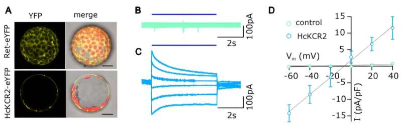 HcKCR2 在植物細胞中起作用 A. 表達 eYFP 標記的 HcKCR2 或?qū)φ?(Ret-eYFP) 的本氏奈瑟菌原生質(zhì)體的共聚焦圖像,在瞬時轉(zhuǎn)化后 48 小時捕獲。B-C.用對照構(gòu)建體(B)或HcKCR2(C)轉(zhuǎn)化的本氏奈瑟菌原生質(zhì)體的膜片鉗實驗中記錄的全細胞電流。將細胞保持在 -60 mV 的保持電位,并以 40 至 -60 mV 的步長進行測試,遞減 20 mV,持續(xù) 8 秒。5 s BL 脈沖 (λ = 490 nm, 5 mW/mm2)施加在每個電壓階躍上。D.對照和HcKCR2表達原生質(zhì)體的I-V關系。圖片來源:科學(2023 年)。DOI: 10.1126/science.adj9696
