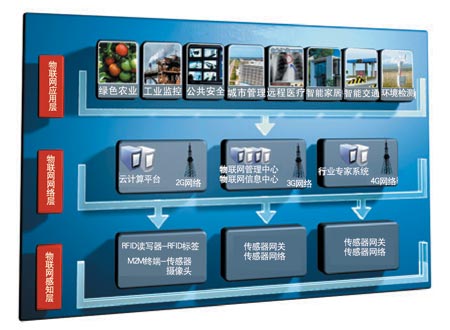 從技術(shù)架構(gòu)上來看,物聯(lián)網(wǎng)可分為三層:感知層、網(wǎng)絡(luò)層和應(yīng)用層。感知層由各種傳感器以及傳感器網(wǎng)關(guān)構(gòu)成,包括二氧化碳濃度傳感器、溫度傳感器、濕度傳感器、二維碼標(biāo)簽、RFID 標(biāo)簽和讀寫器、攝像頭、GPS等感知終端。感知層的作用相當(dāng)于人的眼耳鼻喉和皮膚等神經(jīng)末梢,它是物聯(lián)網(wǎng)獲識(shí)別物體,采集信息的來源,其主要功能是識(shí)別物體,采集信息,并且將信息傳遞出去。網(wǎng)絡(luò)層由各種私有網(wǎng)絡(luò)、互聯(lián)網(wǎng)、有線和無線通信網(wǎng)、網(wǎng)絡(luò)管理系統(tǒng)和云計(jì)算平臺(tái)等組成,相當(dāng)于人的神經(jīng)中樞和大腦,負(fù)責(zé)傳遞和處理感知層獲取的信息。應(yīng)用層是物聯(lián)網(wǎng)和用戶(包括人、組織和其他系統(tǒng))的接口,它與行業(yè)需求結(jié)合,實(shí)現(xiàn)物聯(lián)網(wǎng)的智能應(yīng)用。物聯(lián)網(wǎng)的行業(yè)特性主要體現(xiàn)在其應(yīng)用領(lǐng)域內(nèi),目前綠色農(nóng)業(yè)、工業(yè)監(jiān)控、公共安全、城市管理、遠(yuǎn)程醫(yī)療、智能家居、智能交通和環(huán)境監(jiān)測(cè)等各個(gè)行業(yè)均有物聯(lián)網(wǎng)應(yīng)用的嘗試,某些行業(yè)已經(jīng)積累一些成功的案例。