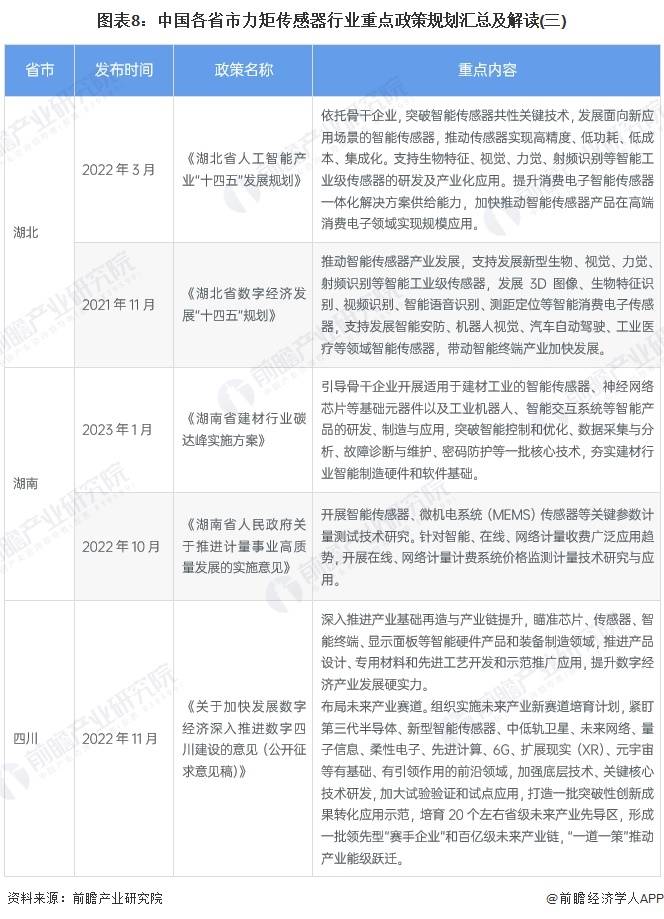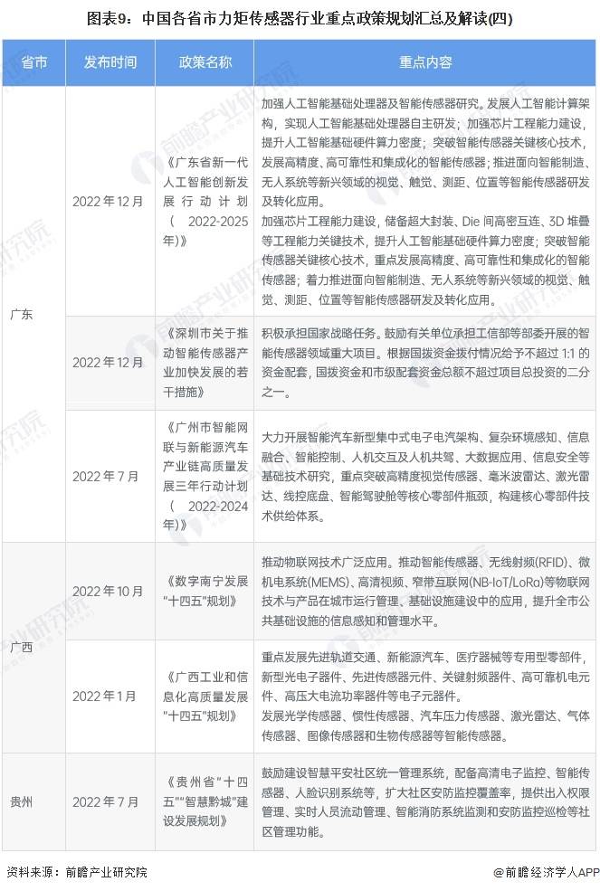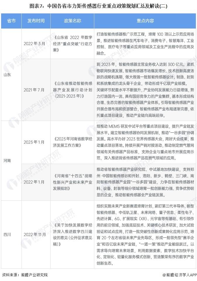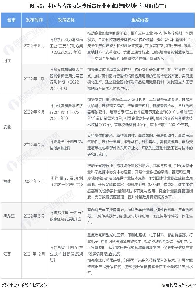 各地政策在傳感器方面發(fā)布的政策較多。盡管針對(duì)力矩傳感器的具體政策條文,但是力矩傳感器在高端裝備等領(lǐng)域應(yīng)用更加廣泛,因此各地政策主要鼓勵(lì)企業(yè)加強(qiáng)新型傳感技術(shù)研發(fā),高端、智能傳感器技術(shù)的突破!逗邶埥 笆奈濉睌(shù)字經(jīng)濟(jì)發(fā)展規(guī)劃》中提出推進(jìn)光學(xué)傳感器、慣性傳感器、壓電傳感器、電感傳感器等功能集成與規(guī)模應(yīng)用,實(shí)現(xiàn)智能傳感器一體化生產(chǎn)!稄V西工業(yè)和信息化高質(zhì)量發(fā)展“十四五”規(guī)劃》中提出發(fā)展光學(xué)傳感器、慣性傳感器、汽車壓力傳感器、激光雷達(dá)、氣體傳感器、圖像傳感器和生物傳感器等智能傳感器。
