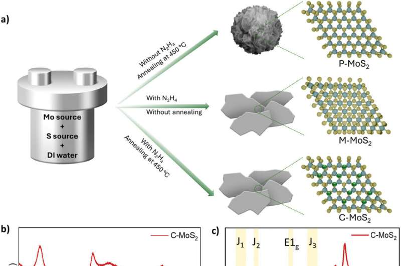 a) N 的示意圖2H4-水熱合成過程中的輔助摻雜策略。b) XRD 圖譜和 c) 所有三種 MoS 的拉曼光譜2顯示晶體結(jié)構(gòu)。學(xué)分:高級(jí)科學(xué) (2024)。DOI: 10.1002/advs.202410825