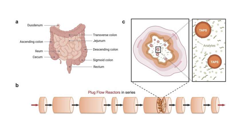 人體腸道系統(tǒng)(a)可被視作一系列活塞流反應(yīng)器(b),這是一種用于描述流動(dòng)圓柱體系內(nèi)化學(xué)反應(yīng)的模型。具有時(shí)間感知能力的微粒傳感器(c)在活塞流系統(tǒng)中移動(dòng),檢測(cè)被稱為分析物的目標(biāo)化學(xué)物質(zhì)。圖片來源:馬寧等人,2025 年。部分圖片由 BioRender 軟件制作。