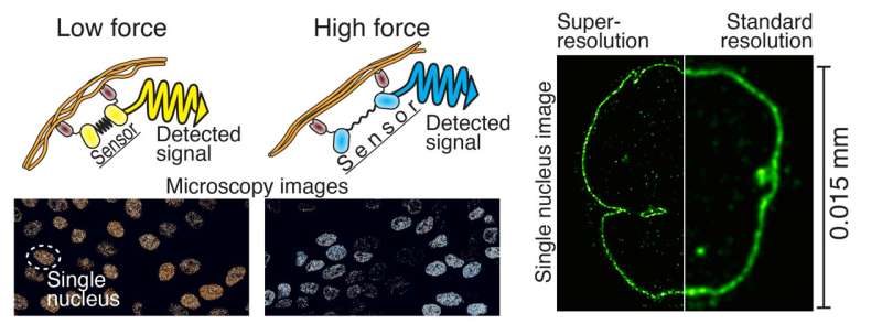 左側(cè)細(xì)胞內(nèi)力傳感器的作用原理。熒光蛋白(黃色和青色)源自水母,而類(lèi)似橡皮筋的部分(黑色)利用了蜘蛛網(wǎng)蛋白。目標(biāo)蛋白結(jié)合抗體(深棕色)源自羊駝。右側(cè)圖像是超分辨率顯微鏡與傳統(tǒng)顯微鏡對(duì)細(xì)胞核成像的對(duì)比。圖片來(lái)源:蒂穆・伊哈萊寧,坦佩雷大學(xué)