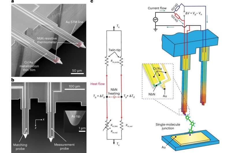 利用這些專門設(shè)計的微型熱傳感器,該團隊研究了通過單分子結(jié)的熱流,發(fā)現(xiàn)某些分子路徑會導(dǎo)致相消干涉 —— 聲子振動的沖突會減少熱流。
