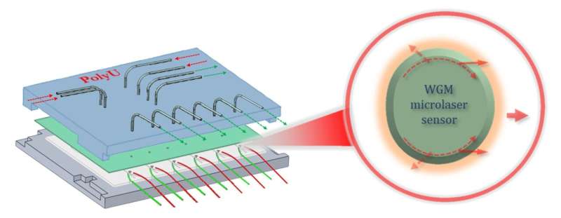 新型聚合物回音壁模式微激光傳感器更易集成到芯片實驗室設(shè)備中,有望實現(xiàn)疾病早期診斷。圖片來源:香港理工大學(xué)張阿平(A. Ping Zhang)