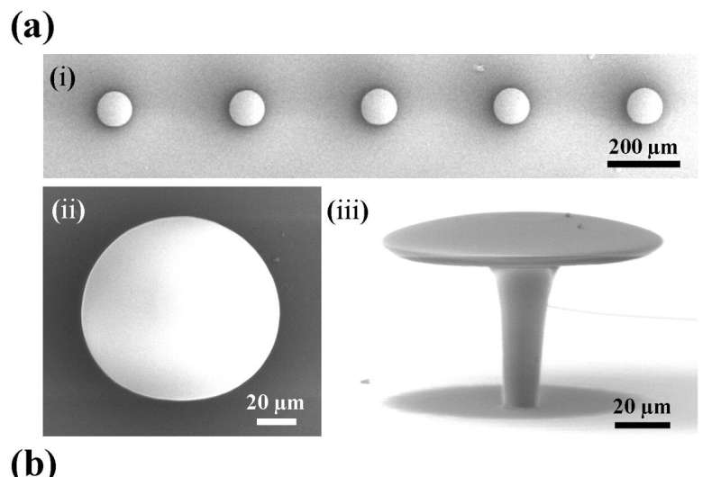 這些掃描電子顯微鏡圖像展示了不同變形程度的 3D 微打印利馬松形回音壁模式微腔:(i)微腔陣列,(ii)單個微腔的放大頂視圖,(iii)單個微腔的放大側(cè)視圖(80° 視角)。圖片來源:香港理工大學(xué)張阿平