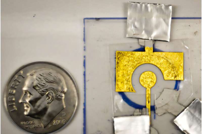 阿里爾・弗斯特實驗室開發(fā)的電化學傳感器由附著在廉價金箔電極上的 DNA 組成,該電極被層壓在塑料片上。圖片來源:研究人員提供;麻省理工學院新聞編輯
