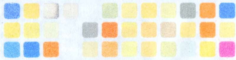為驗(yàn)證概念可行性,塔克團(tuán)隊(duì)通過以下步驟制備傳感器:首先將二氧化硅微米顆粒浸泡在 36 種不同的變色染料溶液中;待顆粒風(fēng)干后,將其放入微孔板,在板上覆蓋一張粘性試紙,隨后翻轉(zhuǎn)微孔板,使含染料的二氧化硅顆粒壓印在試紙上,最終形成一個(gè) 12×3 的變色傳感陣列。為給陣列提供結(jié)構(gòu)支撐,研究人員還在試紙的粘性底面貼上了一張薄金屬片。