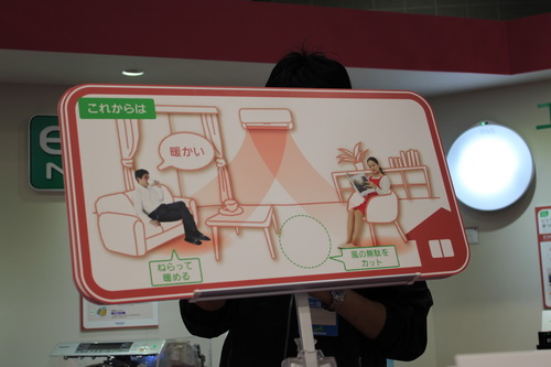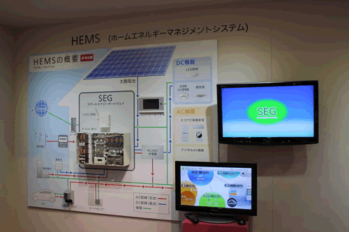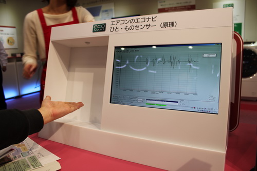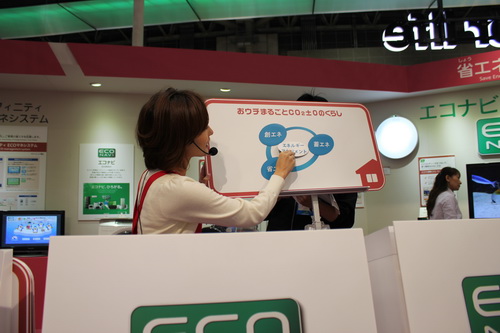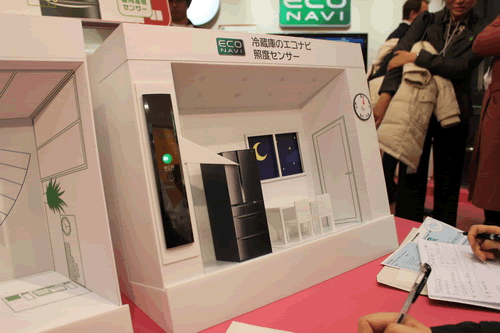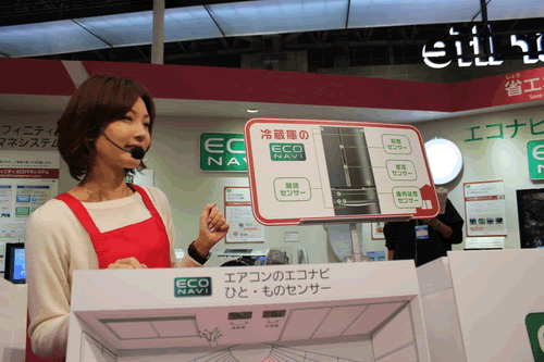 首先我們來到了家庭總體展示區(qū),這里展示裝配了“Eco NAVI”的最新的節(jié)能家電陣容。此外,還可以在這里親身體驗實現(xiàn)了“Eco NAVI”的“亮度傳感器”和“人·物傳感器”。這里還展示了創(chuàng)能的“家用燃料電池”、“太陽能電池HIT®”,蓄能的“家用鋰電池”,能源管理的“Lifinity”、“SEG(智能能源閥門)”,以及住宅用的“EV(新能源汽車)”相關(guān)措施等。當然,和我們?nèi)粘I钭顬橘N近的還是冰箱、空調(diào)等家電產(chǎn)品,有一位美麗的講解員小姐正在上課哦,和記者一起聽聽吧。