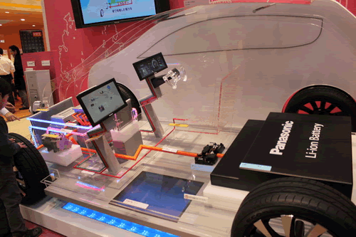看看這是什么?是一臺透明外殼的電動概念車,兩個后輪中間的就是松下的鋰離子電池