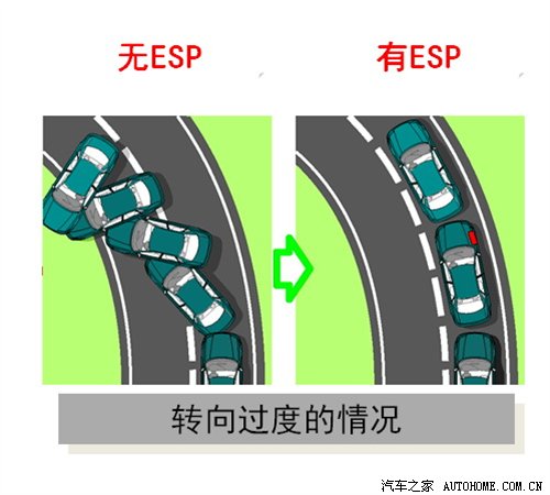 有ESP與只有ABS及ASR的汽車,它們之間的差別在于ABS及ASR只能被動地作出反應(yīng),而ESP則能夠探測和分析車況并糾正駕駛的錯(cuò)誤,防患于未然。ESP對過度轉(zhuǎn)向或不足轉(zhuǎn)向特別敏感,例如汽車在路滑時(shí)左拐過度轉(zhuǎn)向(轉(zhuǎn)彎太急)時(shí)會產(chǎn)生向右側(cè)甩尾,傳感器感覺到滑動就會迅速制動右前輪使其恢復(fù)附著力,產(chǎn)生一種相反的轉(zhuǎn)矩而使汽車保持在原來的車道上。