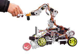 它其貌不揚,身高只有十余厘米,外形宛若一輛迷你月球車。底部是一輛“小車”,長約30厘米,裝有4個轱轆,讓它可以360度隨意“行走”。車身下面裝有5片灰度傳感器,類似人類的眼睛,可以用來辨別顏色深淺。車身四周裝有兩片碰撞傳感器,讓機器人學(xué)會了讓路,還可以避免車禍。同時,車身前面,有一塊液晶顯示屏,這可是它的臉蛋,可以充分表達它出的喜怒哀樂。還有一個重要的組成部分,就是它的手臂,由四塊“骨頭”、兩根“手指”組成,能抓取、托運任意方向的物體,還可以和人握手。