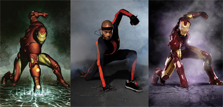 穿戴著Xsens公司MVN Motion Capture彈力纖維套裝的演員(中間),身上鑲滿了ADI公司的MEMS慣性傳感器。他模仿傳奇漫畫"鋼鐵俠"插圖中的特征手勢(左),作為創(chuàng)作派拉蒙影業(yè)公司"鋼鐵俠2”(右)動畫的基礎(chǔ)。