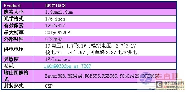 比亞迪微電子推出的HD 720P產(chǎn)品的型號(hào)是BF3710CS,是一款1/6inch采用0.13um工藝的百萬像素圖像傳感器,像素尺寸為1.9umx1.9um,有效像素為1297x817,支持16:10和16:9的窗口。內(nèi)部集成了AE、AWB、AGC,Lens shading,Gamma校正等多種ISP處理功能,以及CDS噪聲消除電路,輸出Bayer RGB,RGB444,RGB555, RGB565,YCbCr422,CCIR656等多種圖像格式,滿足大多數(shù)后端處理器的接口需求。內(nèi)部集成了LDO,可單路電壓供電,節(jié)省外圍器件和PCB空間。