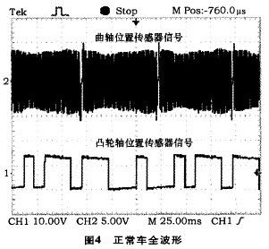 故障分析與測試采用雙蹤示波器同時測量故障車上曲軸位置傳感器與凸輪軸位置傳感器的波形如圖1所示,在同類型的正常車上測得的凸輪軸位置傳感器和曲軸位置傳感器波形如圖2所示!