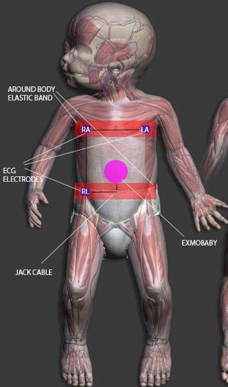 這張圖片顯示了Exmobaby嬰兒服各種傳感器的位置。