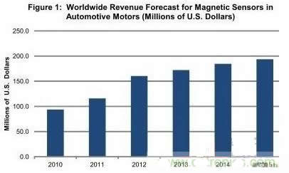 最新預(yù)計(jì)硅磁傳感器在汽車電機(jī)中的應(yīng)用率將急增。由于能夠改善汽車安全性、便利性和燃油效率,硅磁傳感器在汽車電機(jī)中的應(yīng)用將快速增長(zhǎng),該市場(chǎng)的銷售額將在2012年增長(zhǎng)近40%。2012年汽車電機(jī)領(lǐng)域的磁傳感器銷售額將達(dá)到1.603億美元,延續(xù)最近三年的穩(wěn)健增長(zhǎng)勢(shì)頭。盡管2012年以后銷售額增長(zhǎng)速度將會(huì)放緩到一位數(shù),但2010-2015年的復(fù)合年度增長(zhǎng)率仍將達(dá)到16%。到2015年,汽車電機(jī)領(lǐng)域的磁傳感器銷售額將上升到1.936億美元。