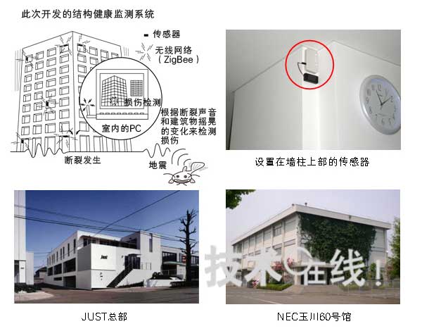 此次的結(jié)構(gòu)監(jiān)測(cè)系統(tǒng)結(jié)合了大林組的損傷檢測(cè)及分析技術(shù)、NEC的無(wú)線(xiàn)通信及信息收集應(yīng)用構(gòu)筑技術(shù)以及JUST的傳感器技術(shù)共同開(kāi)發(fā)而成。應(yīng)用對(duì)象是以鋼筋混凝土結(jié)構(gòu)的建筑物。由于開(kāi)發(fā)了低價(jià)傳感器,網(wǎng)絡(luò)采用無(wú)線(xiàn)設(shè)計(jì),無(wú)需鋪設(shè)有線(xiàn)的通信線(xiàn)路,因此導(dǎo)入成本降到了原來(lái)的十分之一以下。