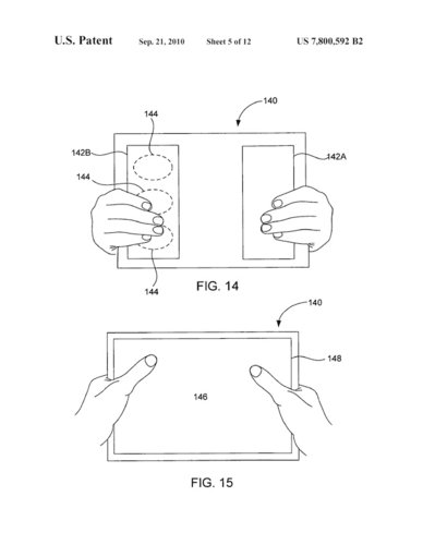 蘋(píng)果在2006年申請(qǐng)的該項(xiàng)專利。該專利通過(guò)在設(shè)備表面上的一個(gè)或者多個(gè)觸摸傳感器,來(lái)保護(hù)手持設(shè)備。這些傳感器可以獲取用戶手掌的像素圖像,與存檔中的相應(yīng)圖像進(jìn)行比照,并依此設(shè)定設(shè)備的軟件和用戶資料。