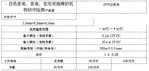 該系列產(chǎn)品與現(xiàn)有產(chǎn)品(SPVQ3系列∶長5.8mm×寬13.0mm×高8.35mm)相比在體積比上約減少50%(機體尺寸∶長5.3mm×寬8.3mm×高6.5mm),實現(xiàn)了小型化。本產(chǎn)品是作為用于汽車、白色家電及其他廚房、衛(wèi)生間等設(shè)備上的機構(gòu)動作檢測等其用途很廣泛的產(chǎn)品來開發(fā)出來的。